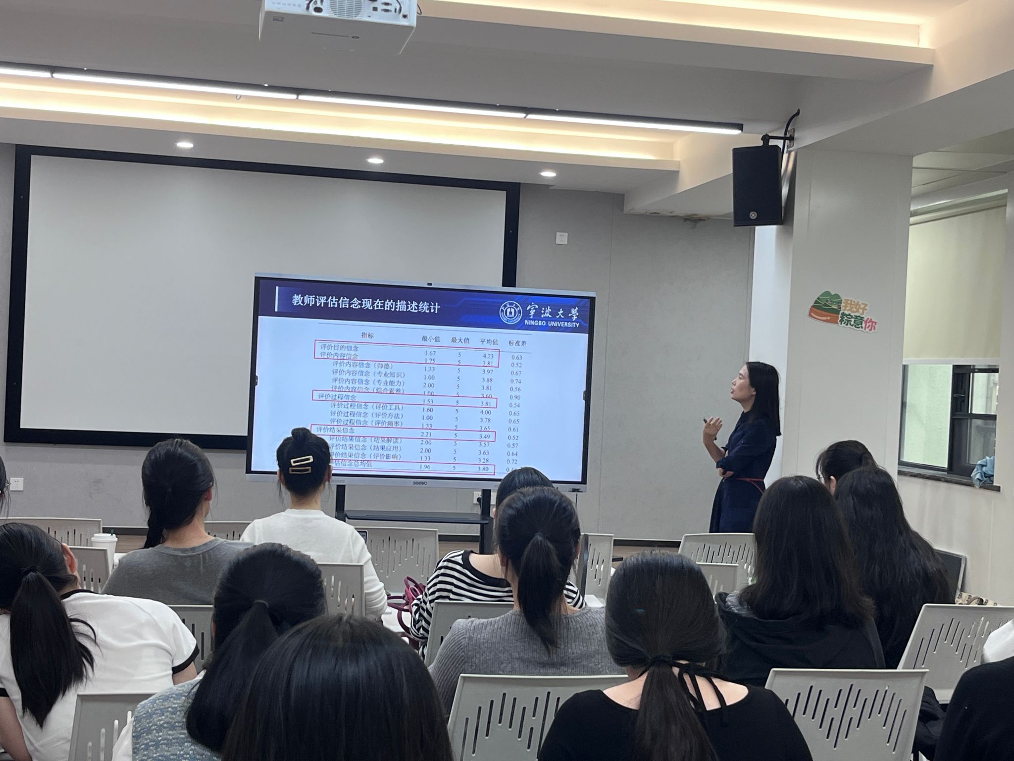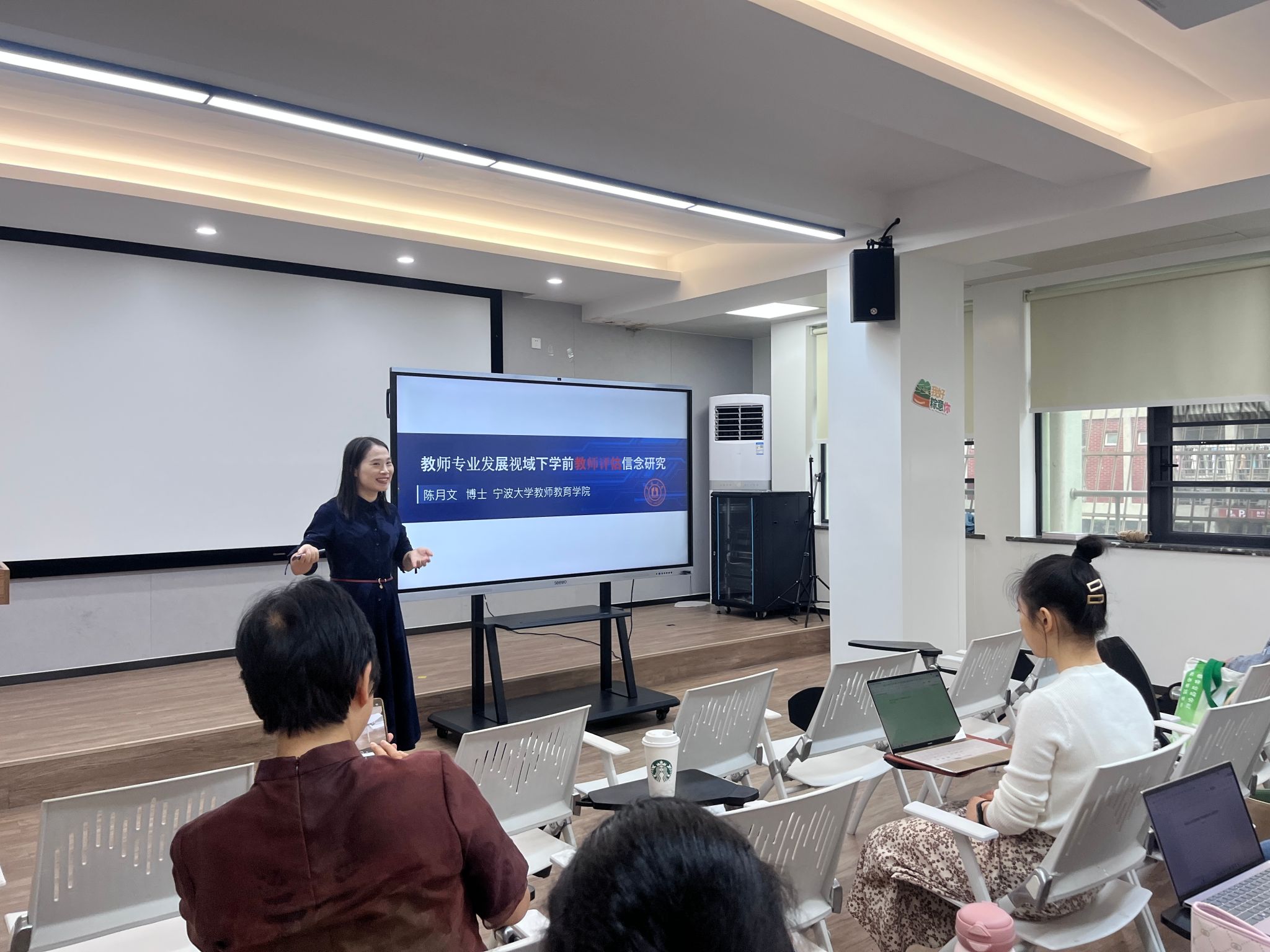 在随后的报告中,陈月文老师围绕“研究目的、方法与设计”、“教师评估信念的构成及其影响特征”、“探索不同评估信念下的教师实践路径”、“总结、建议与未来展望”四大核心内容,展开了全面而深入的阐述。陈老师通过严谨的研究方法、丰富的实证研究案例,以及亲切的现场互动,不仅展示了学前教师评估信念研究的相关成果,更为同学们提供了宝贵的学术启示和研究思路。