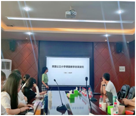 第一阶段由徐旭烨同学汇报,汇报主题是“美国公立小学课堂教学改革探究”。汇报内容包括“美国公立学校整体变革、美国公立小学课堂教学改革、变革程度有限的原因分析”三个方面。