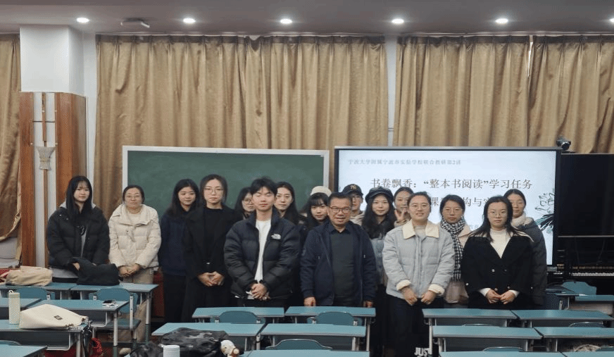 附属宁波市实验学校,与初中语文组开展本学期第二次“联合教研”活动。主要环节有:课堂教学观摩、授课老师分享备课心得、基地学校教师教研点评、冯教授专题讲座。