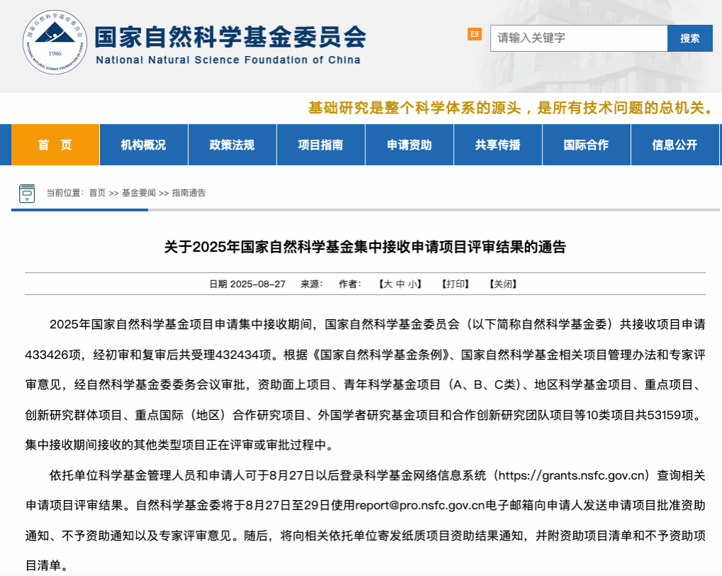 2025年8月27日,国家自然科学基金委员会正式公布2025年度集中接收申请项目评审结果,天美传媒