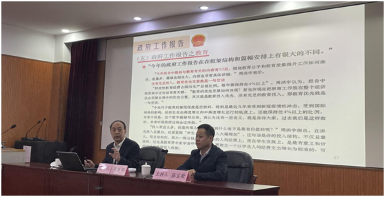 随后,周洪宇教授着重讲述了政府工作报告,尤其对教育方面的报告进行了详细讲述。在讲座的后半程,周洪宇教授解读了2023年两会中提到的一些教育热点话题。例如,“建议完善托育补贴和报销政策”、“建议在全国中小学推行‘趴睡’变‘躺睡’”、“充分保证中小学生实现优质午休”、“推进高等教育综合改革着力造就拔尖创新人才”等。