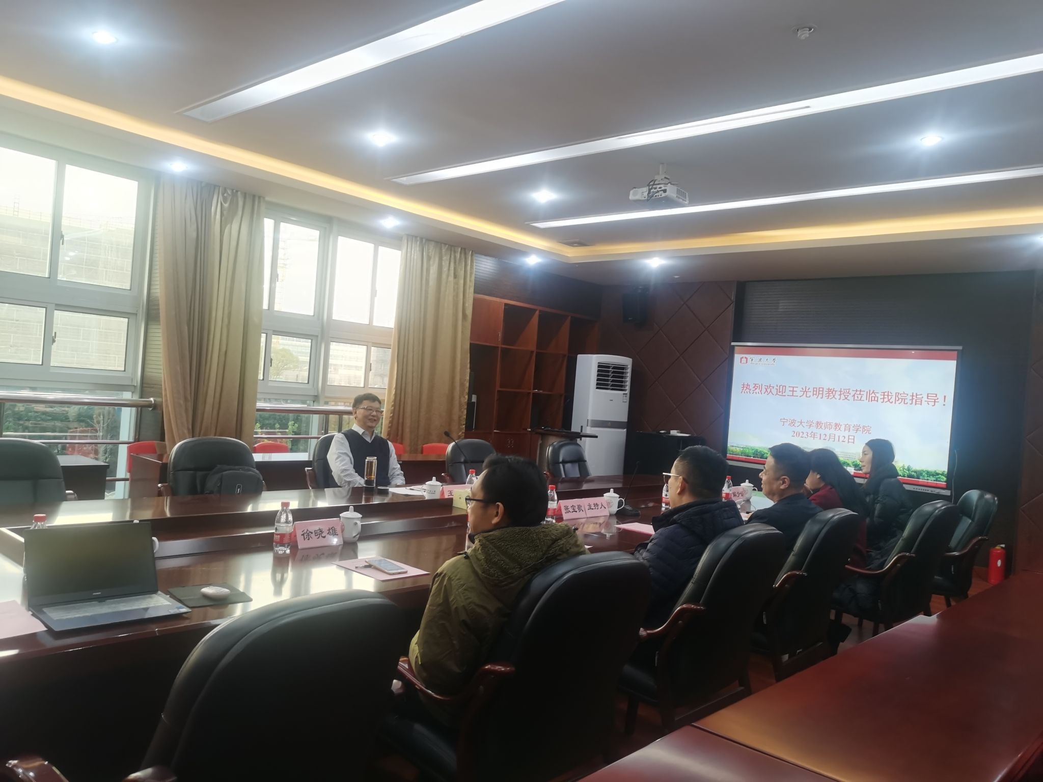 张宝歌院长从基本情况、博士点申报准备、现实困境及发展举措四个方面对教育学学科建设情况作出汇报,副院长刘希伟教授从材料准备方面对当前工作进度作出汇报。王光明教授依据汇报情况对教育学科建设作出重要指导。