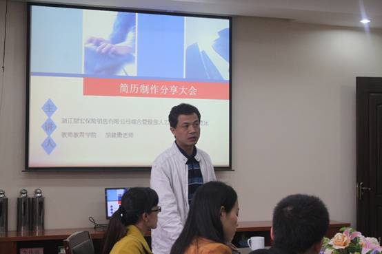 11月14日(星期四)下午1点半,在博观楼401会议室开展了简历制作大赛分享大会,出席会议的有浙江鼎宏保险销售有限公司综合管理部人力资源总监夏冰、天美传媒
