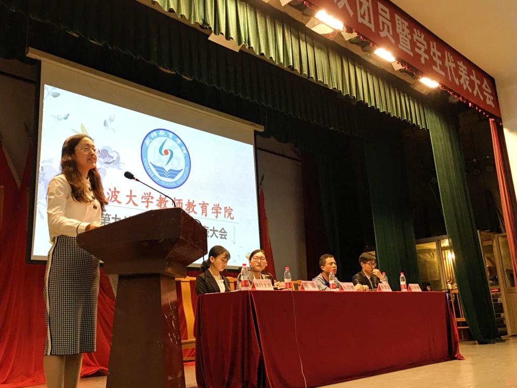 在后台唱票过程中,大会听取和审议了上一年学院分团委、学生会、社工委工作报告。院分团委书记冯剑锋老师对本次报告进行创新,以答辩形式展开,玩笑式地以“作”为态度,由“引领”“提升”“开拓”“突破”“传承”五个角度对思想建设、组织建设、校园文化、科研创新、公益实践五个方面进行汇报,赞扬教室教育学院拥有“一流的团学社”,与会的同学是“最优秀的青年”。院学生会主席罗晓娟同学也巧妙地用一节英语课的形式进行汇报,呼应师院特点,围绕family这一单词,介绍了学生会的特色以及工作情况。