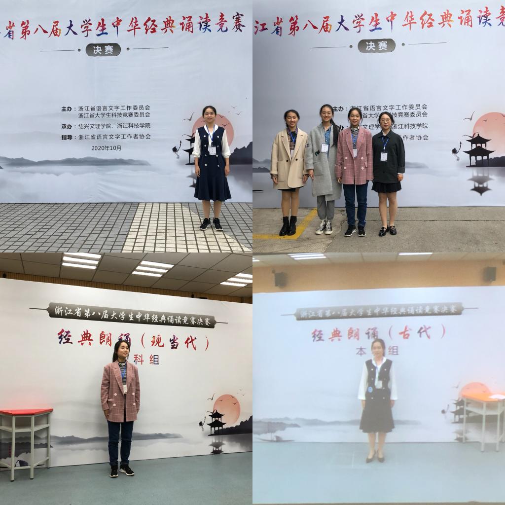 10 月17日- 18日,“浙江省第八届大学生中华经典诵读竞赛”在绍兴文理学院举行。本届竞赛由浙江省大学生科技竞赛委员会主办、绍兴文理学院承办,赛事项目分“回答问题”、“中华经典朗诵”和“即兴演讲”三个环节。大赛历时1天半时间,经过激烈角逐,最终,我校四位参赛选手脱颖而出,分别荣获一等奖(3项)、二等奖(1项)的优异成绩。特别,天美传媒