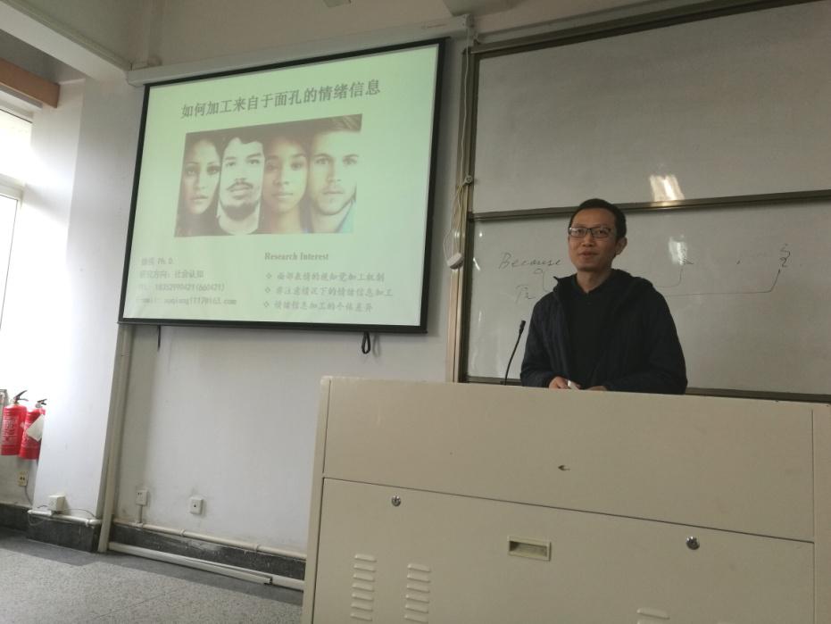 徐老师围绕“面孔的情绪信息的加工方式研究”展开,向同学们分享了面孔情绪的加工过程和编码阶段。首先,徐老师解释了面孔的敏感部分(N170)的所在大脑区域,使同学们对面孔情绪加工有了初步了解;其次,徐老师通过三个实验研究来验证面部加工的contaxt(上下文)效应是与背景有关,其中的高期望背景体现了物体与目标一致性的符合。最后,徐老师给同学们看了一段小视频,来解释了非注意是什么过程及非注意情况下人脑对其他事物的加工程度。