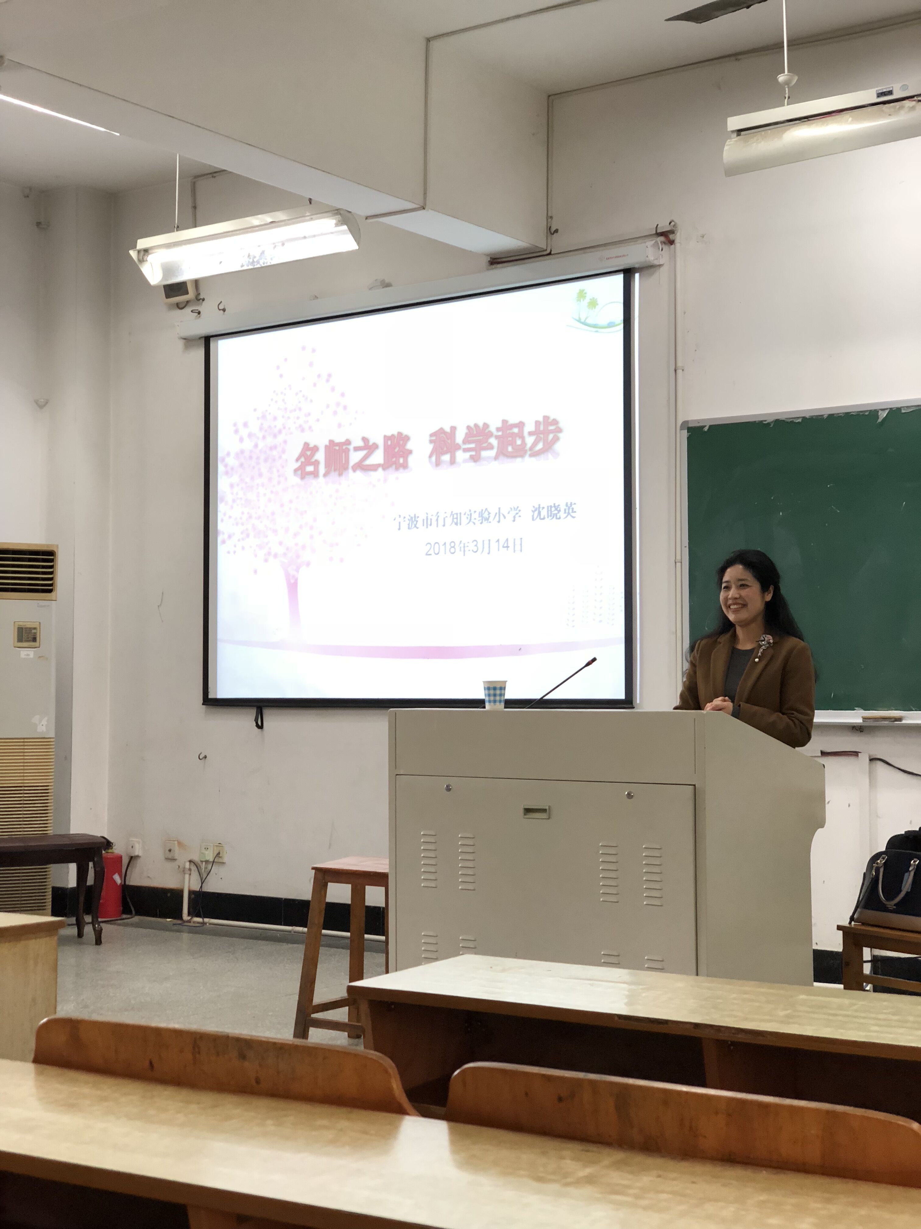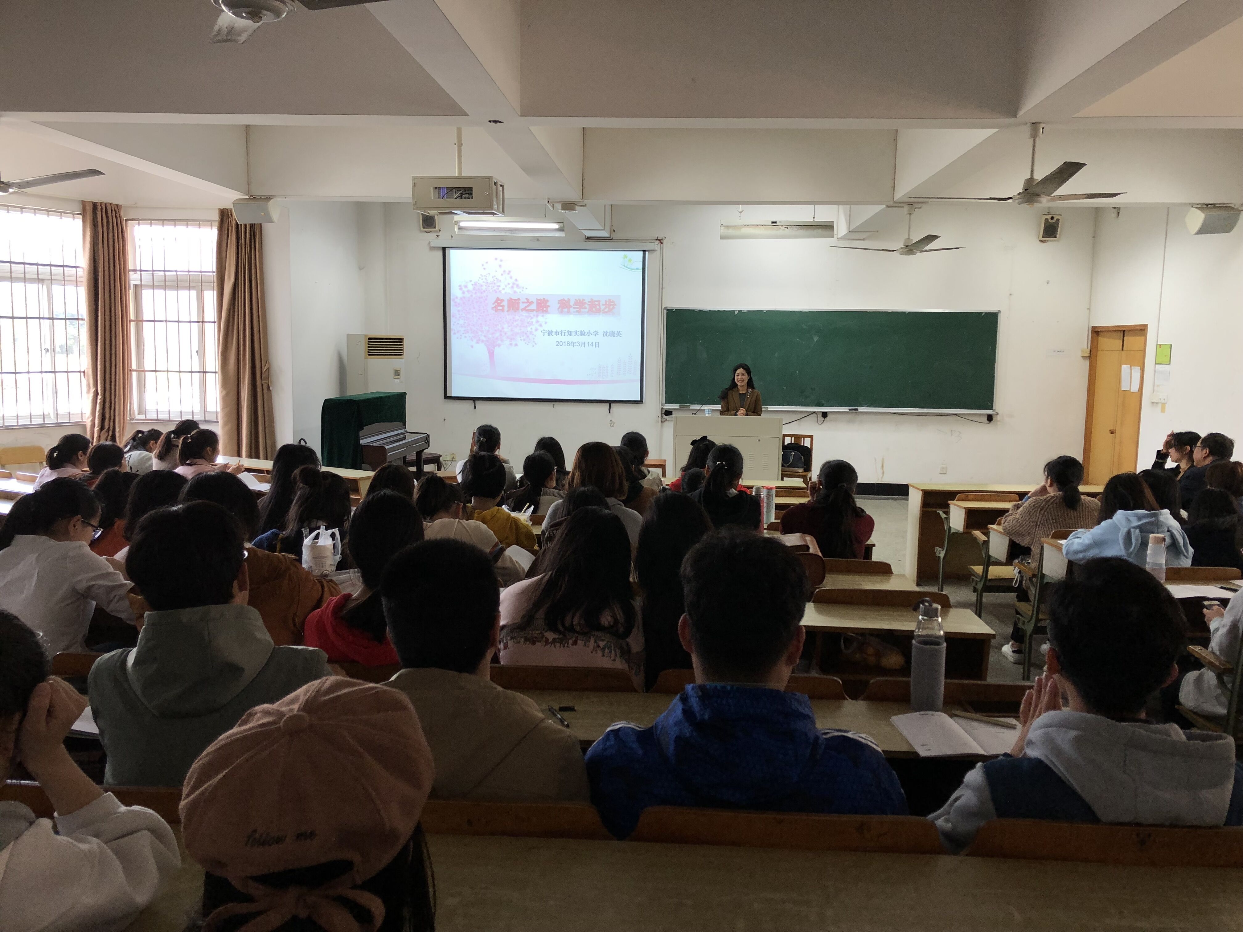 “教育智慧大讲堂”第八十九讲在实验楼111如期举行。本次讲座有幸邀请到宁波行知实验学校校长、特级教师沈晓英老师,17级小教专业各班学生前来听讲。讲座由小教系副主任王成如老师主持。