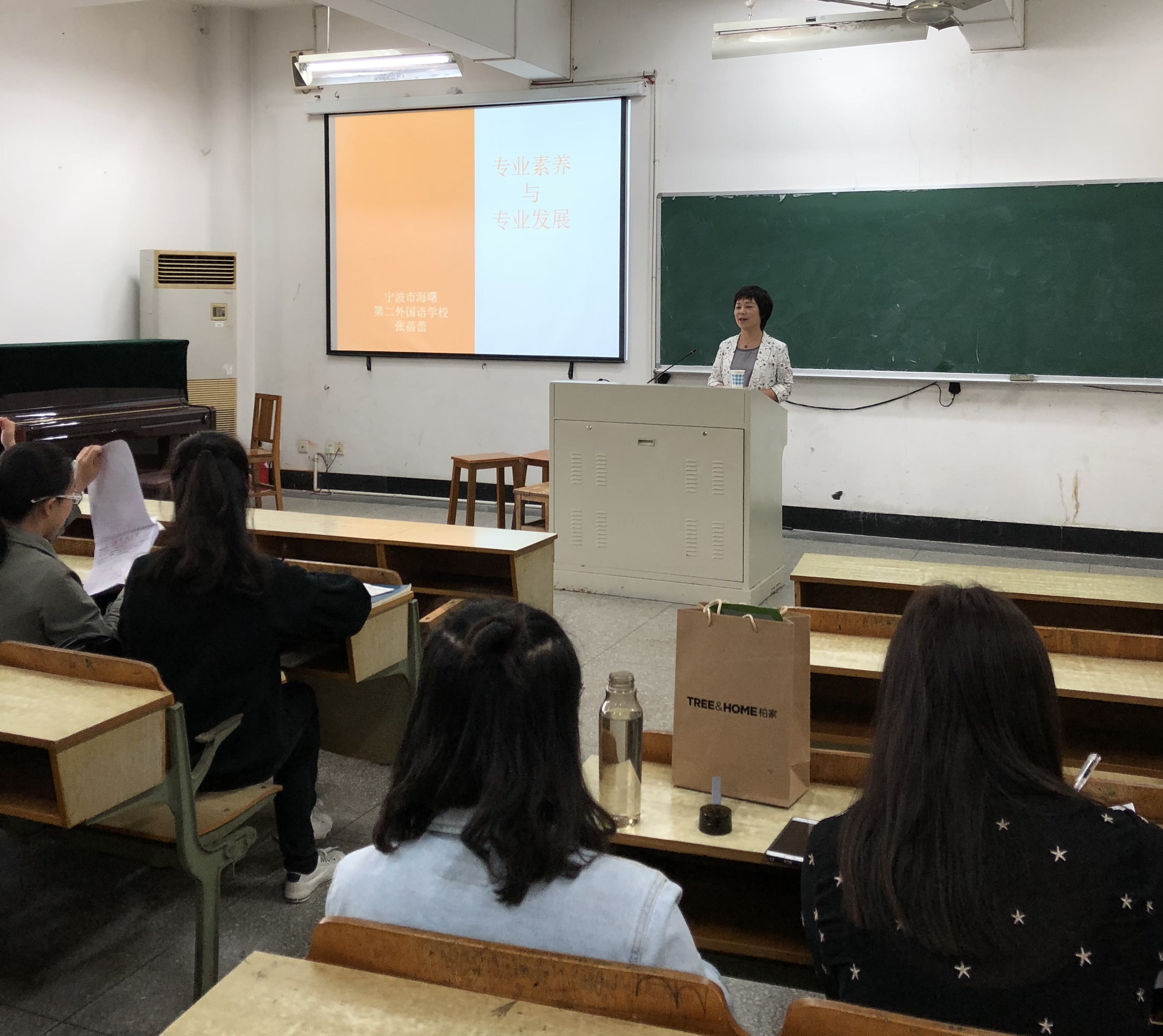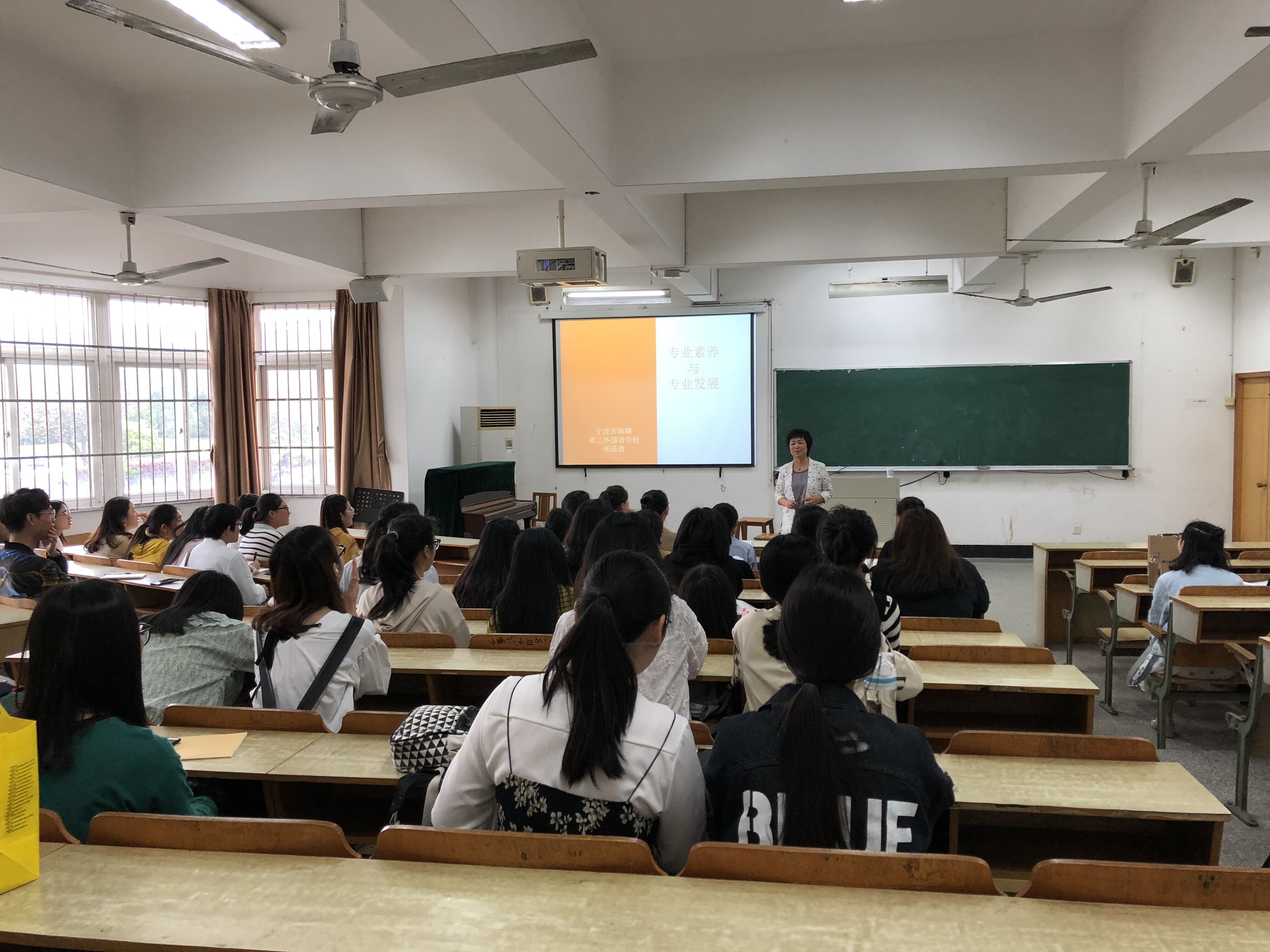“教育智慧大讲堂”第九十讲在实验楼111如期举行。本次讲座邀请到宁波市学科骨干教师、海曙第二外国语学校小学部校长张蓓蕾老师主讲,英教各年级同学到场聆听。讲座由英语教育系系主任张光陆老师主持。