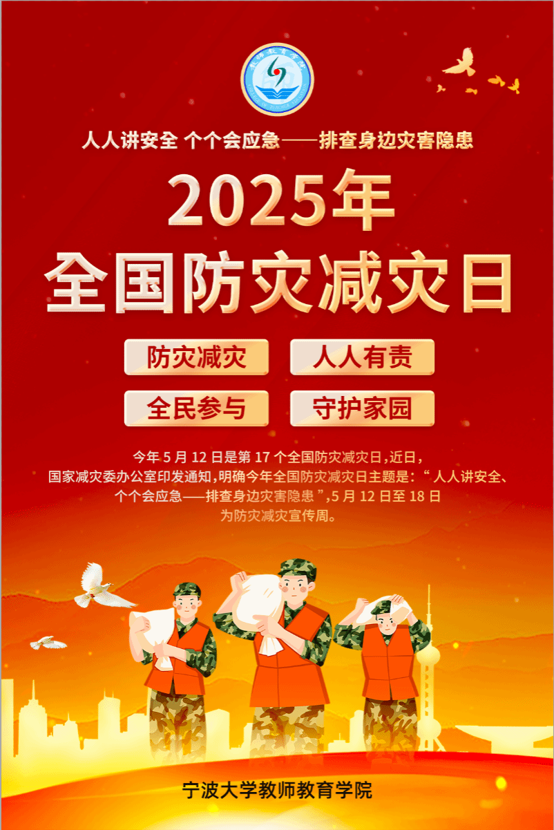 3.防灾减灾海报:2025年5月12日是第17个全国防灾减灾日,主题为“人人讲安全,个个会应急——排查身边灾害隐患”。通过宣传防灾减灾知识,提高大家的应急处置能力,增强灾害预防意识,提高大家的应急能力。