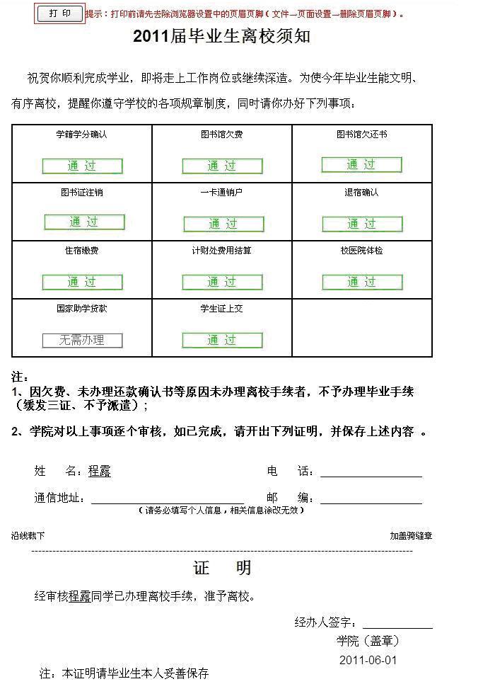 所有必办环节完成后,学生凭电子离校单(学生本人或学院老师打印均可)去学院确认离校。