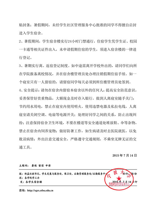 【寝室管理】转发:关于做好2015年学生暑假留校住宿工作的通知