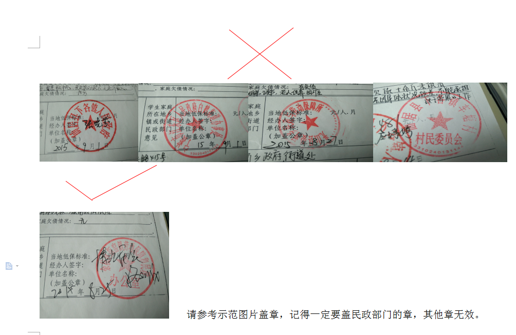 (3)需加盖当地民政部门公章,如果因为特殊原因章不符合要求,可向学工办负责老师说明情况商定。(注:公章必须为民政部门公章,其他如街道、社区等公章均无效)请参考下图示范图片;