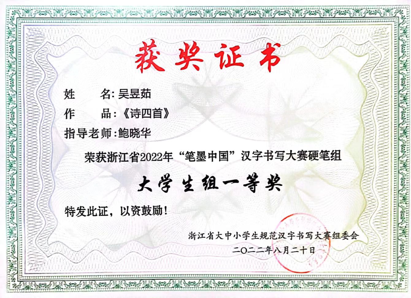 4名学生在全国数万件参赛作品中脱颖而出,在评选出的大学生组硬笔书法一、二、三等奖和优秀奖共313人中(浙江高校占27人),天美传媒