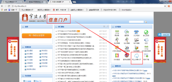 1、 在宁大内网主页右侧点击“网上办事大厅”或学校外网主页上方点击“办事大厅”,并登录。