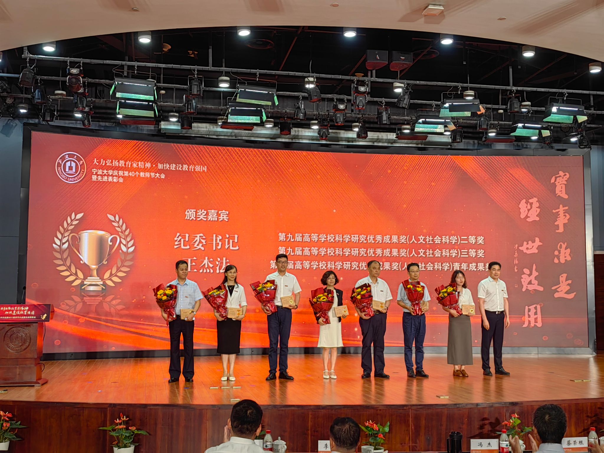 获得第九届高等学校科学研究优秀成果奖(人文社会科学)二等奖的张宝歌老师(左一)、获得第九届高等学校科学研究优秀成果奖(人文社会科学)三等奖的贺国庆老师(右四)和邵光华老师(右三)颁奖