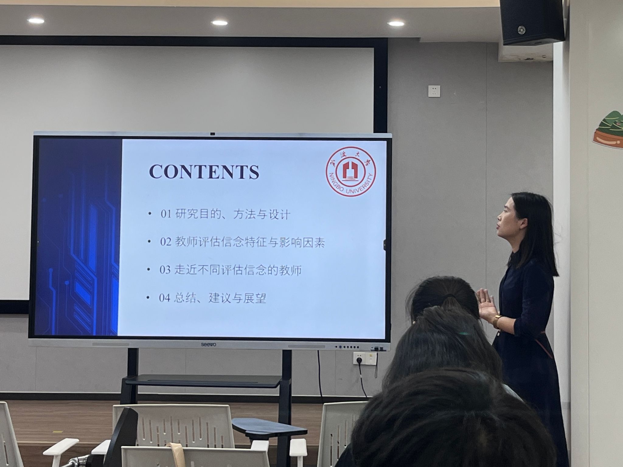 在随后的报告中,陈月文老师围绕“研究目的、方法与设计”、“教师评估信念的构成及其影响特征”、“探索不同评估信念下的教师实践路径”、“总结、建议与未来展望”四大核心内容,展开了全面而深入的阐述。陈老师通过严谨的研究方法、丰富的实证研究案例,以及亲切的现场互动,不仅展示了学前教师评估信念研究的相关成果,更为同学们提供了宝贵的学术启示和研究思路。
