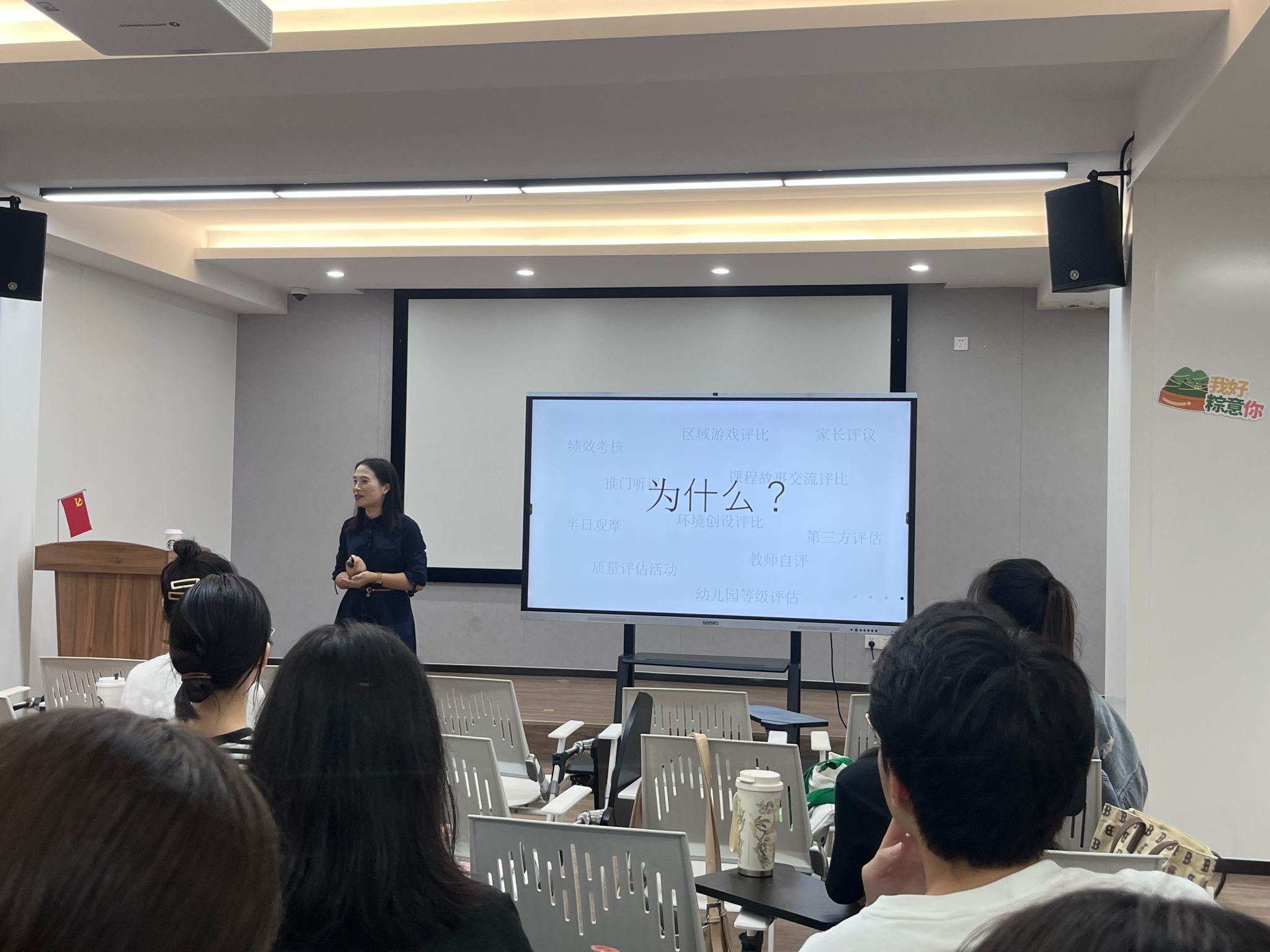 首先,陈月文老师以一系列问题作引子,引发了同学们深入的思考与热烈的讨论。然后,陈老师从评估的奖惩性目的与发展性目的两个维度,提出了评估在学前教育中的必要性与价值,为正式导入讲座主题作铺垫。