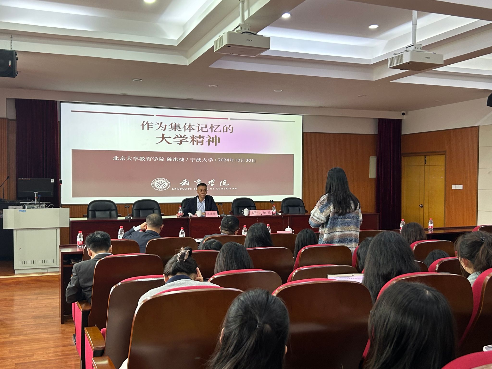 2024年10月30日,北京大学中国博士教育研究中心主任、《北京大学教育评论》主编、中国高等教育学会高等教育专业委员会副理事长、中国学位与研究生教育学会研究生教育专业委员会副主任、国务院学位委员会教育学科评议组成员,欧美同学会德奥分会副会长,蔡元培研究会秘书长,北京大学教育学院特聘教授陈洪捷莅临宁波大学教师教育学院,带来了一场主题为“作为集体记忆的大学精神”的精彩讲座,学院全体师生积极参与,教师教育学院张宝歌院长代表学院向陈洪捷教授的莅临致以热烈的欢迎和诚挚的感谢。