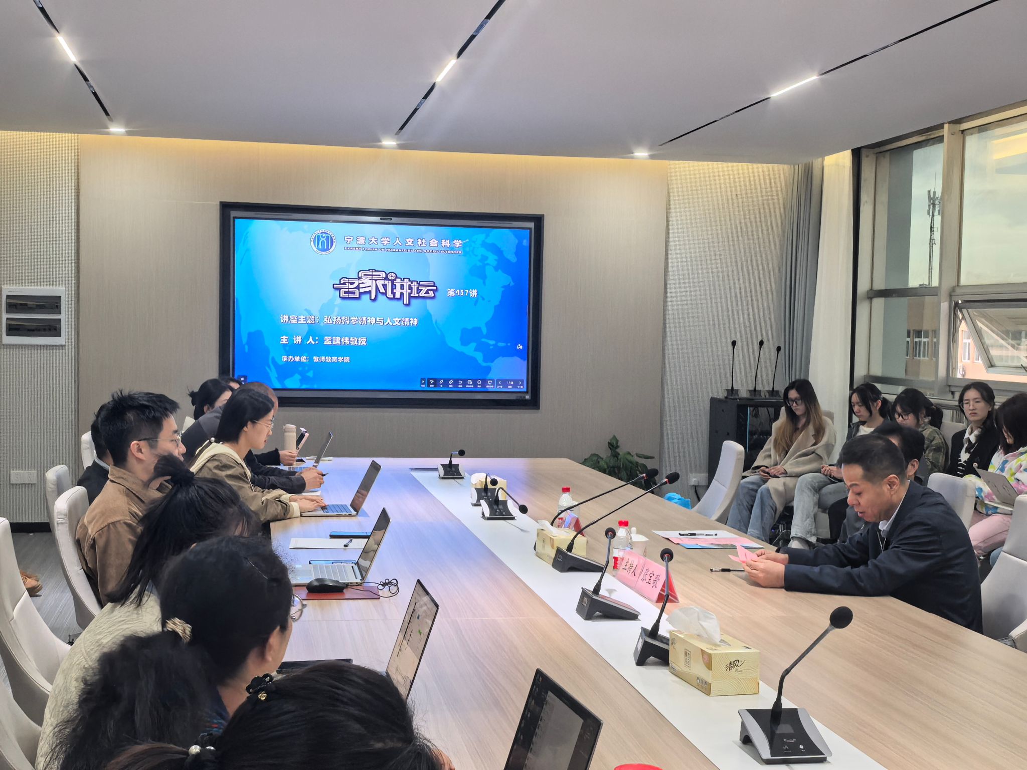 2024年11月7日,教师教育学院举办人文社科名家讲坛第437讲,中国科学院大学孟建伟教授莅临学院作主题为“弘扬科学精神与人文精神”的专题报告,教师教育学院相关师生参加讲座,院长张宝歌教授主持讲座并代表学院向孟建伟教授的到来表示热烈欢迎。