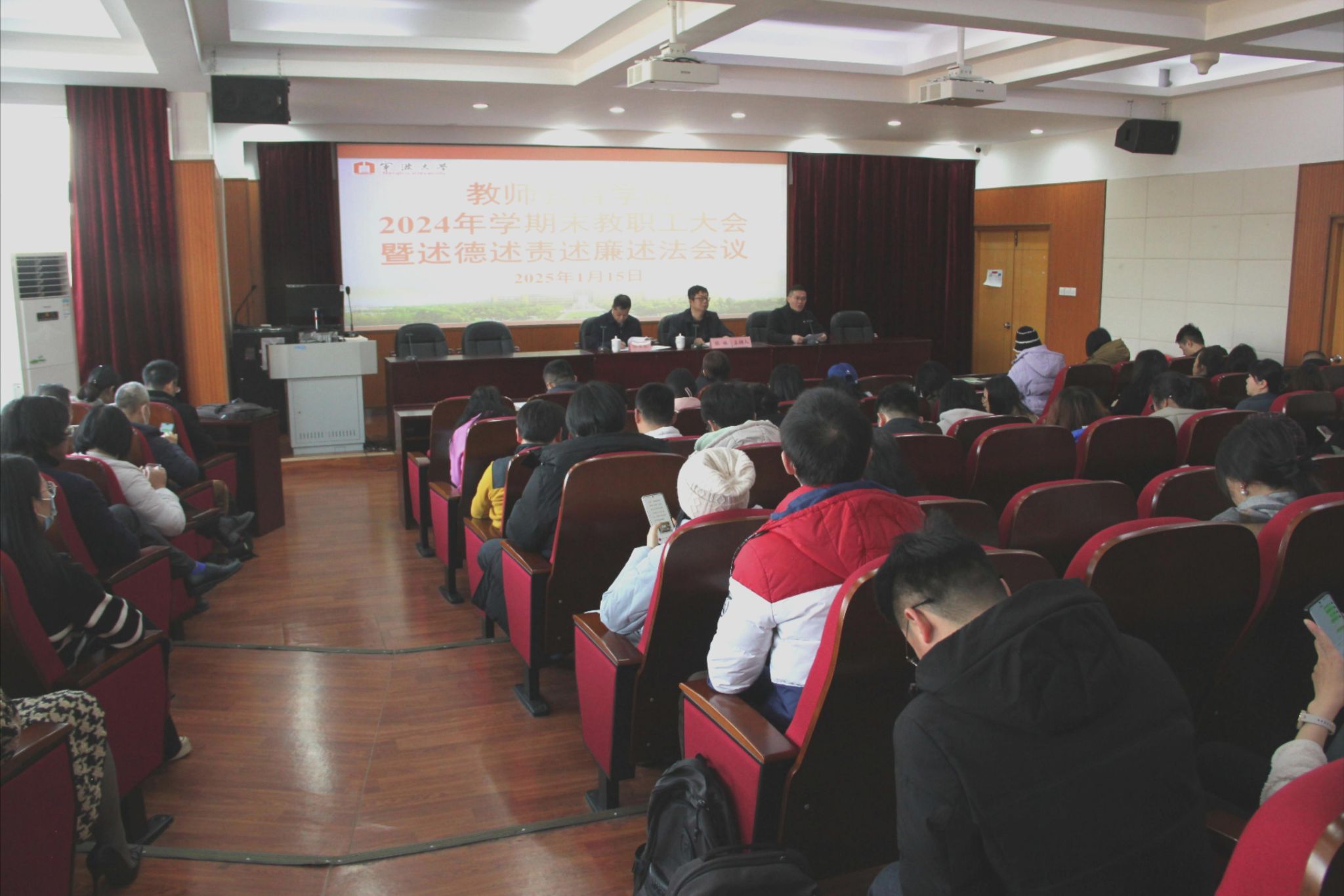 1月15日,教师教育学院2024年学期末教职工大会暨述德述责述廉述法会议在教育楼211会议室举行。会议由院党委书记张林主持,院党政班子成员及全体教职工参会。