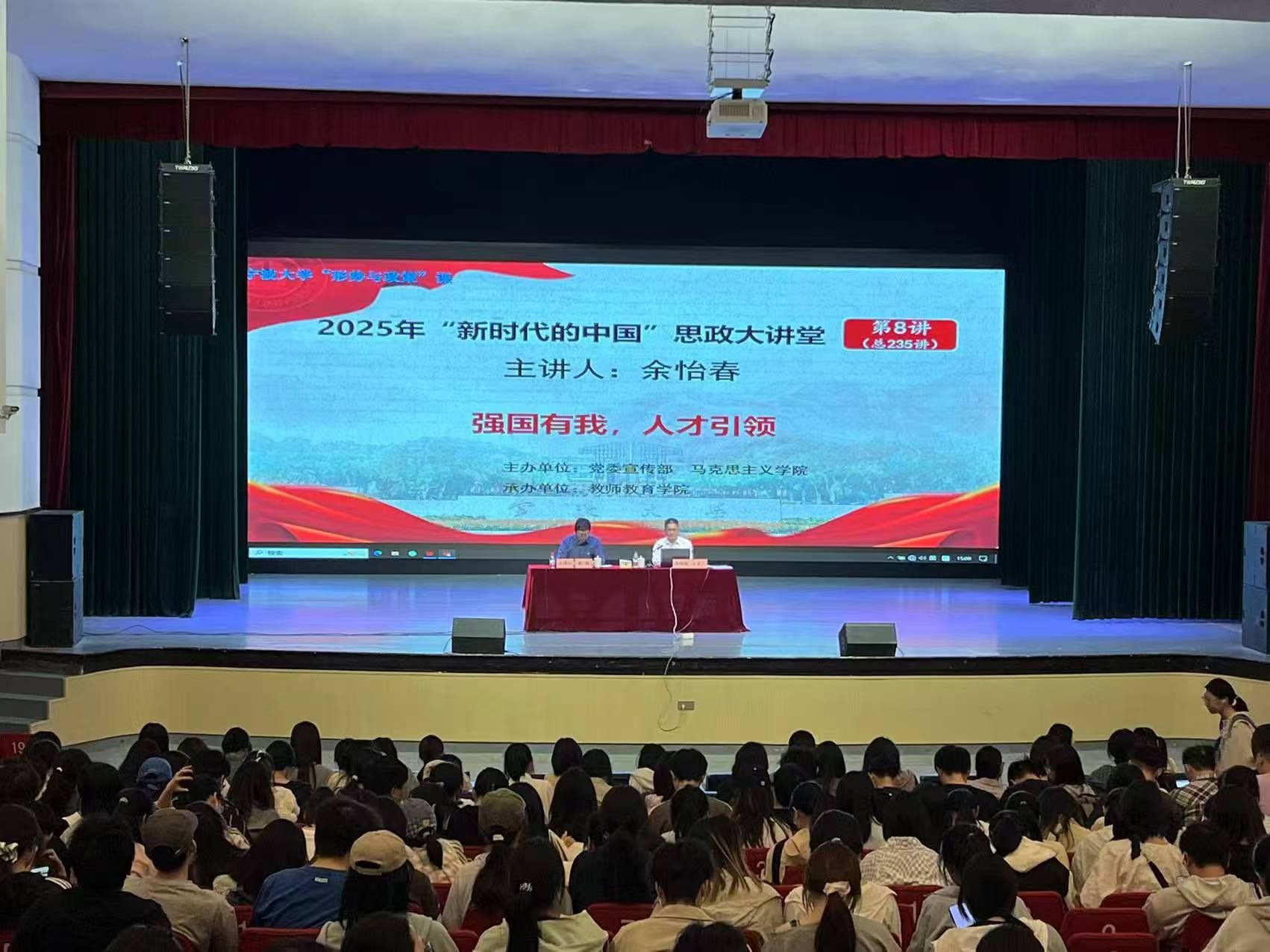 4月30日下午,宁波大学党委委员、宣传部部长余怡春以“强国有我,人才引领”为主题,在林杏琴会堂为教师教育学院师生讲了一堂内涵丰富、绘声绘色的“形势与政策”课,教师教育学院近700位师生现场聆听了这堂思政大课。