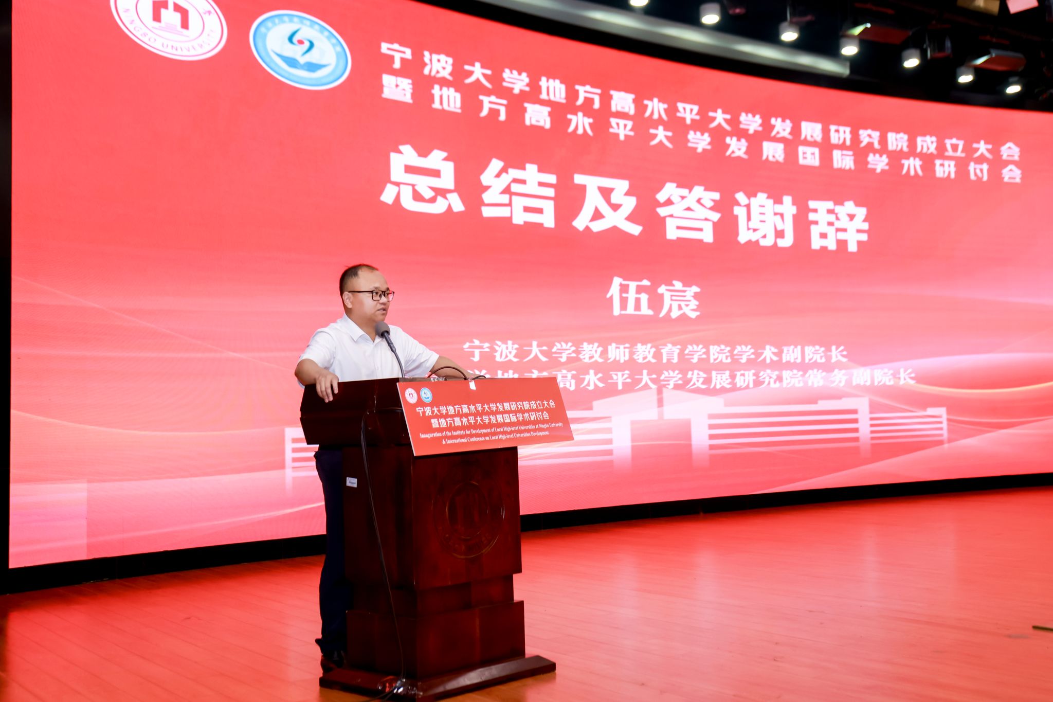 最后,伍宸教授对本次会议的成功召开表示衷心的感谢,研究院的成立与会议的成功召开离不开各学术前辈的倾囊相授,离不开学术同仁们的鼎力相助,更离不开学校领导和各部门的关心支持。宁波大学地方高水平大学发展研究院作为一个新成立的学术机构,更需要得到大家共同的关心和呵护才可能茁壮成长。宁波大学地方高水平大学研究院的成立,是教育学科服务高等教育强国战略,服务区域高等教育高质量发展以及服务学校“双一流”建设的重要举措。研究院的揭牌及国际学术论坛的成功举办,标志着宁波大学在教育学科开辟了新的研究领域。未来,研究院将牢记使命,不负学界的期待和学校的支持,通过整合校内外相关学术资源,以服务学校发展为根本使命,深化与国内外相关研究机构的交流与合作,努力建成具有广泛影响力的学术研究平台、高等教育人才培养的重要基地,为促进学校的高质量发展和高等教育强国建设贡献宁大力量。