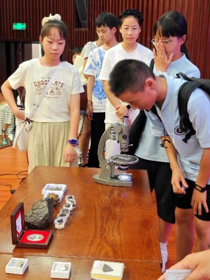 宁波市效实中学的正高级教师毛锦旗老师在《穿越星际:陨石解码宇宙奥秘》讲座中,通过一个个生动案例,讲述了陨石中蕴含的宇宙信息,毛老师还为同学们带来了显微镜与真实的陨石标本,带领同学们进行了一场跨越星际的“对话”。