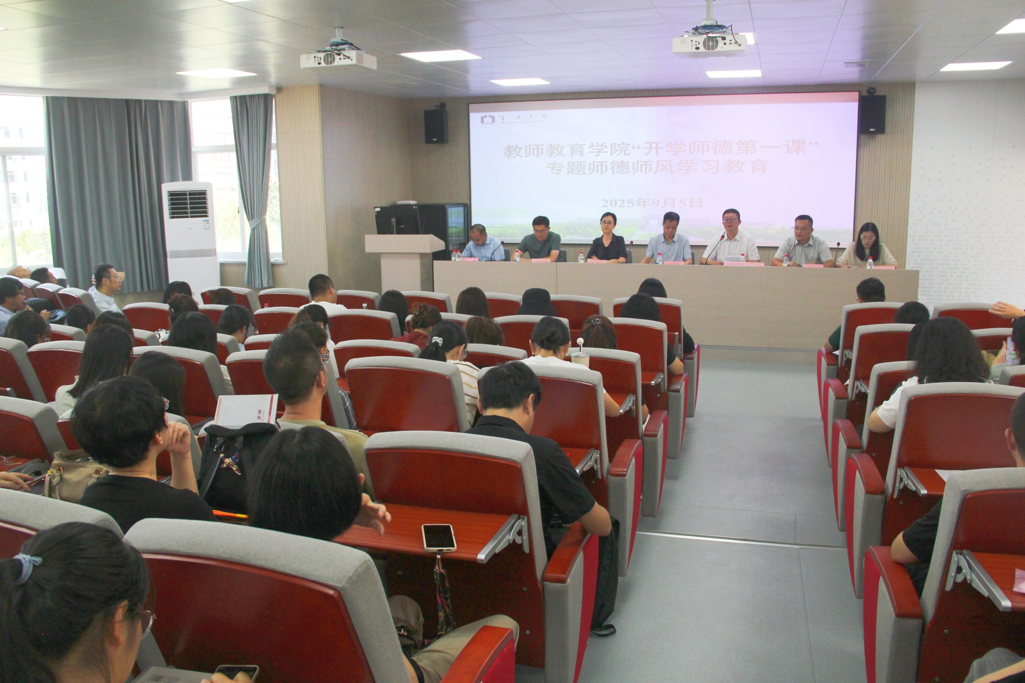 9月5日上午,教师教育学院召开了2025年秋季学期首次全体教职工大会暨“开学师德第一课”。学院党委书记张林主持会议,学院党政领导班子成员以及全体教职工参加了会议。会议首先介绍了新入职教工并表示热烈欢迎。接着,各位党政领导逐一发言,通报了本科教学、教学竞赛、研究生教育、就业与新生报到、科研等方面的工作进展,部署了新学期相关任务。学院党委书记张林向会议传达了学校2025年暑期中层领导干部扩大学习会精神。在我国第41个教师节即将来临之际,张书记在大会上带头宣讲“开学师德第一课”,开展专题师德师风学习教育,组织全体教职工一同重温学习习近平总书记关于师德师风的重要论述、《中华人民共和国教师法》、《新时代高校教师职业行为十项准则》等内容。此外,张书记就校园安全稳定相关规定进行了专题学习教育,并针对2025年中秋、国庆期间正风肃纪工作提前进行了部署。张书记强调,全体教职工要以此次“开学师德第一课”为起点,以教育家精神为指引,以严明纪律为底线,不忘初心、牢记使命,在教书育人的道路上勇担新责、再立新功。学院院长张宝歌围绕当前发展形势、学科建设、教学科研、师资队伍等方面,为学院新学期重点工作指明方向,强调全院教职工需树立危机意识、主动适应变革,以实干推动学院高质量发展。在未来规划上,张院长提出三大方向:一是优化调整专业,积极筹建“人工智能+教育”新专业;二是创新硕士点学科建设,对接国家重大需求发展交叉学科;三是持续推进博士点建设,提前谋划学科专业布局。此次大会明确新学期任务、强化师德要求、规划发展方向,为教师教育学院秋季学期工作有序开展、实现高质量发展奠定坚实基础。