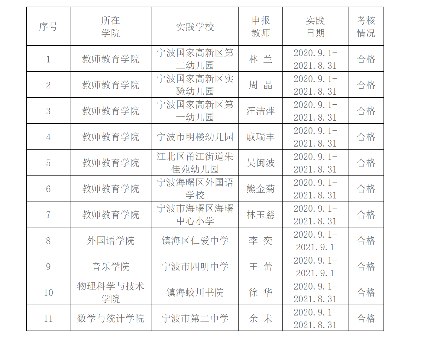 根据《天美传媒 教教师教育实践能力培养实施办法(试行)》(宁大政〔2020〕40号)文件,教务处对2020-2021学年教师教育实践能力培养考核合格的相关人员进行公示,具体名单如下: