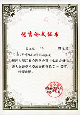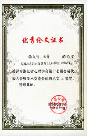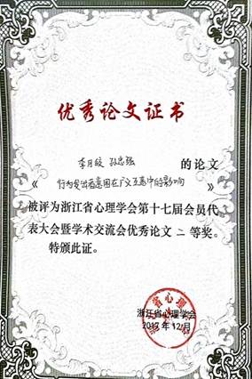 2017年12月23日至24日,浙江省心理学会第十七届会员代表大会暨学术交流大会在浙江省金华市浙江师范大学召开。受学科经费资助,宁波大学心理学研究所60余名研究生参与学术交流,并积极提交论文参与优秀论文评选。宁波大学心理学研究所研究生提交的参评论文共获得一等奖1篇,二等奖2篇,三等奖4篇。其中,2015级段继鹏同学等提交的论文“基于群体信息的行为预测机制”荣获一等奖;2015级李月皎同学等提交的论文“行为发出者意图在广义互惠中的影响”和2015级杨张祥同学等提交的论文“施虐人格的心理结构及其与冲动性人格的关系”荣获二等奖;此外,陈满、韩尚锋、王红芳、周玮四位同学提交的论文分别荣获三等奖。