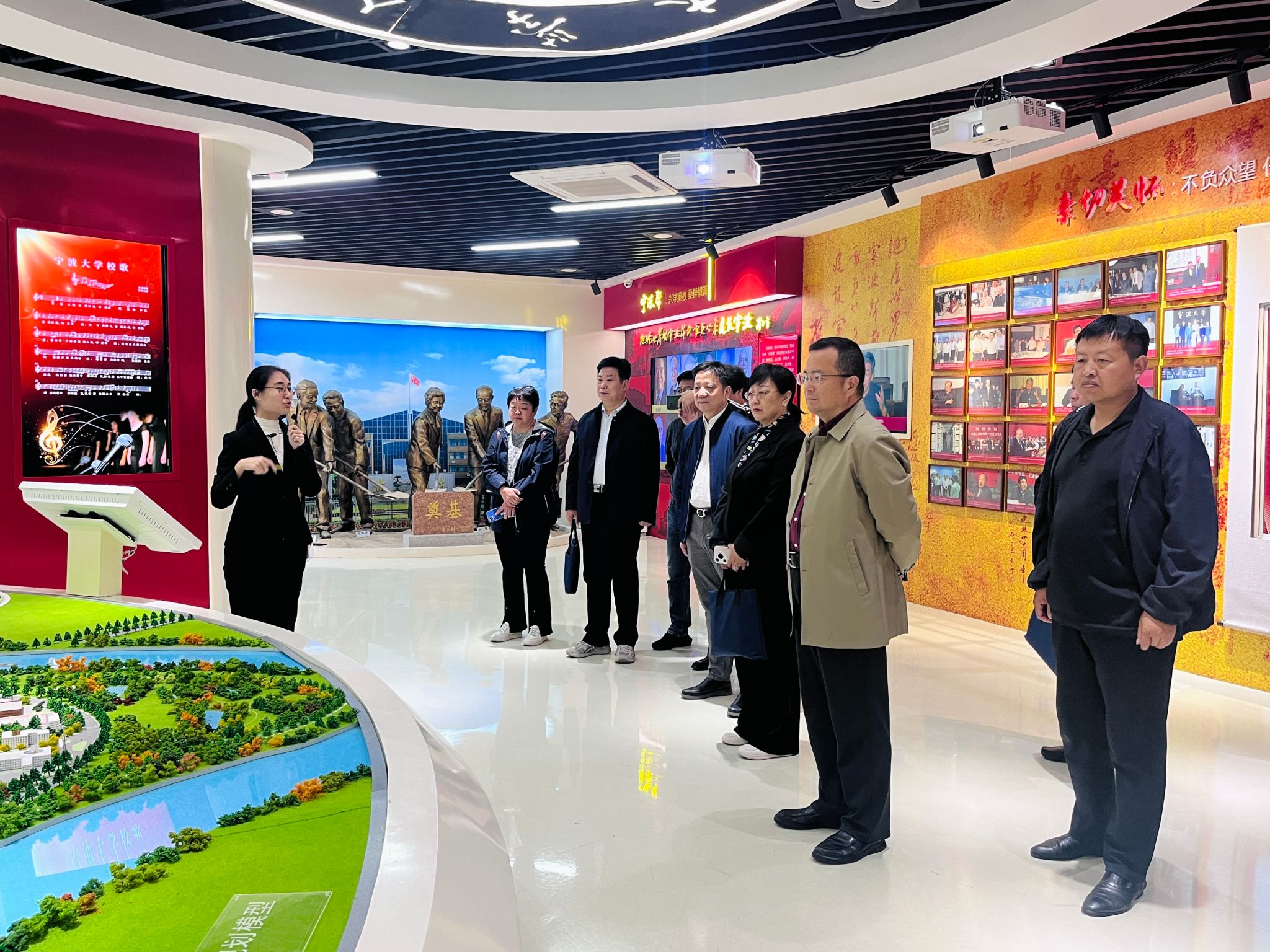 在讲解员的带领下,李刚一行驻足参观了宁波大学校史展厅的各个展区,穿梭于历史的长廊,深入了解宁波大学自创立以来从初创的艰辛到如今的发展历程,沉浸式感受“宁波帮”感恩文化。
