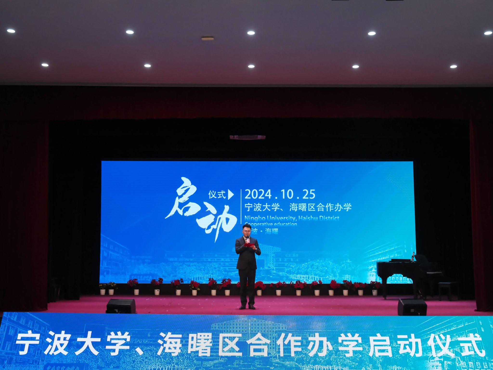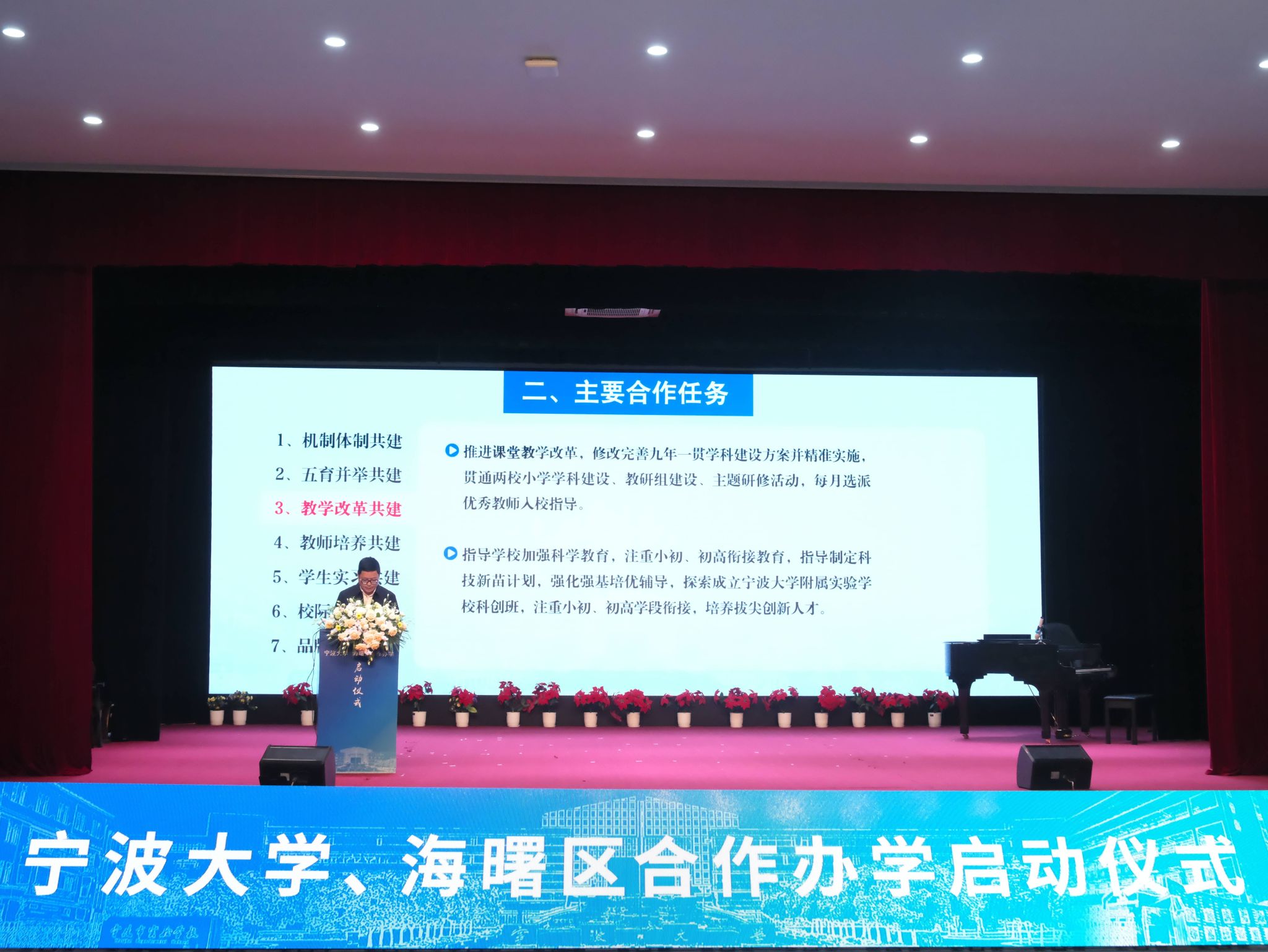 海曙区教育局相关负责人解读《合作共建附属实验学校框架协议》。现场举行宁波大学与海曙区合作办学的签约和揭牌。随后,附属实验学校学生奉献了一场精彩的合唱与器乐演出。