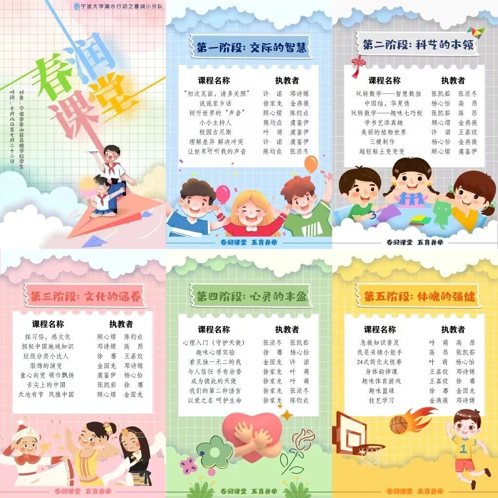 在之后为期两周的实践时间里,滴水行动之春润小分队将会走进海岛,从交际的智慧、科艺的本领、文化的涵养、心灵的丰盈、强健的体魄五个方面,结合专业知识与象山高塘当地特色,为海岛上的孩子们带去“春润”课堂,“五育”课程,把素质教育的理念带进海岛,跨越山海共谋发展,携手互助共创未来!
